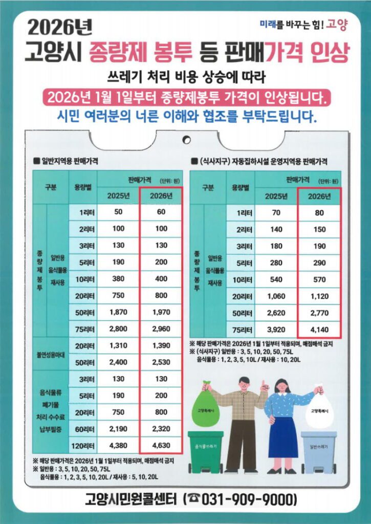 고양시가 2026년 1월 1일부터 종량제봉투 및 음식물류 폐기물 처리 수수료 가격을 인상합니다.쓰레기 처리 비용 상승에 따른 조정이라고 하니, 쓰레기 배출량을 줄이고 분리배출을 더 정확히 하는 것이 관련 지출을 줄이는 데 도움이 될 것 같습니다.새해부터 달라질 종량제 봉투 판매가격은 아래 표에서 확인하세요.